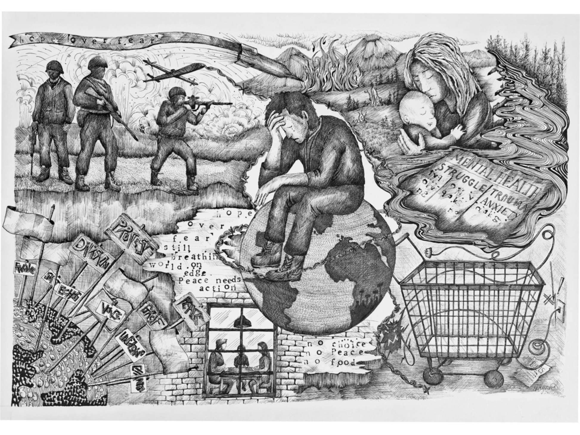 This piece responds to the theme of World Events by exploring the ongoing and overlapping crisis, shaping human experience today, war, poverty, mental health , rising cost of living and political division all collide in this work- symbolised through figures, objects and textures that reflect colllective struggle. At the Heart is a curled figure burdened by the weight of the world. Around them a mother holding child, solders, an empty sopping trolley, energy monster, protest flags, a floating newspaper floating in the flood lands and walls marked by trauma speak to displacement, survival resistance and hope. Running quietly through the composition is my metaphor hidden somewhere in the piece - the washing machine. Life in today’s world can feel like being trapped inside it, spinning relentlessly, being thrown around by force we did not choose, unable to stop or breathe. It’s a metaphor for overwhelm , but also for desire to come out, cleaner, clearer and sometimes whole. The title “ still we struggle” captures both exhaustion and the persistence of the human spirit, strength to fight, strength to keep going even if the days seem much harder.