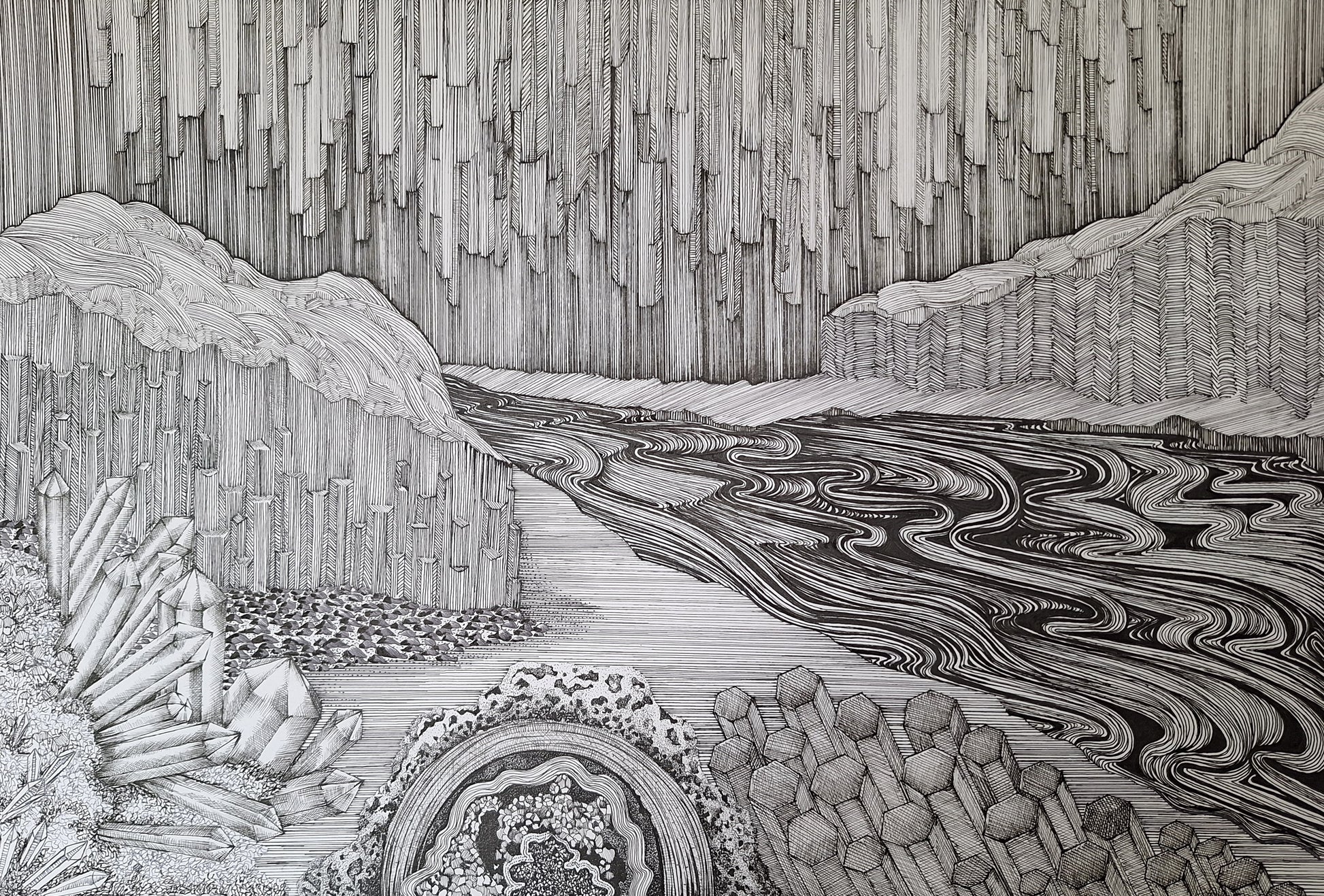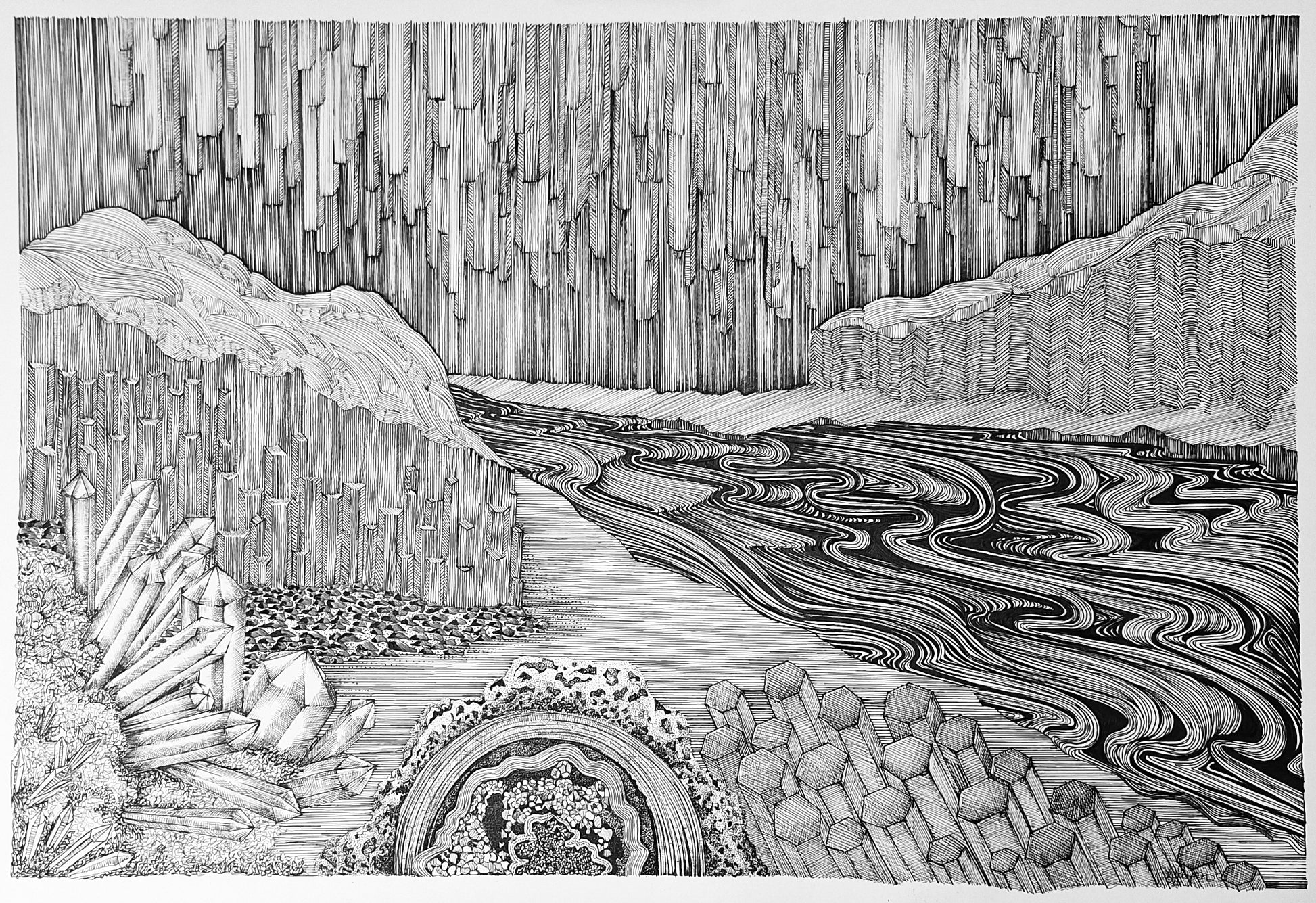 Their practice centers on detailed mark-making, using line to sculpt surface and structure. Every stroke contributes to a rhythm that mirrors the natural world’s quiet patterns—hexagonal columns, swirling currents, crystalline growths. Through this meditative process, Stone Flow becomes both a geological homage and a visual meditation on time, pressure, and transformation.